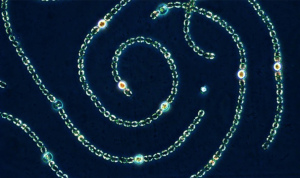 Blágræna bakterían Anabaena circinalis í Mývatni. The cyanobacterium Anabaena circinalis in Mývatn.