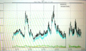Svifþörungar og bakteríur í útfalli Laxár úr Mývatni.Skjámynd af sírita RAMÝ á Geirastöðum. Línuritið á myndinni hefst 6. ágúst. A record of the phytoplankton in the river Laxá. It is dominated by Cyanobacteria (blue line). Black line represents total phytoplankton. This graph begins August 6th.